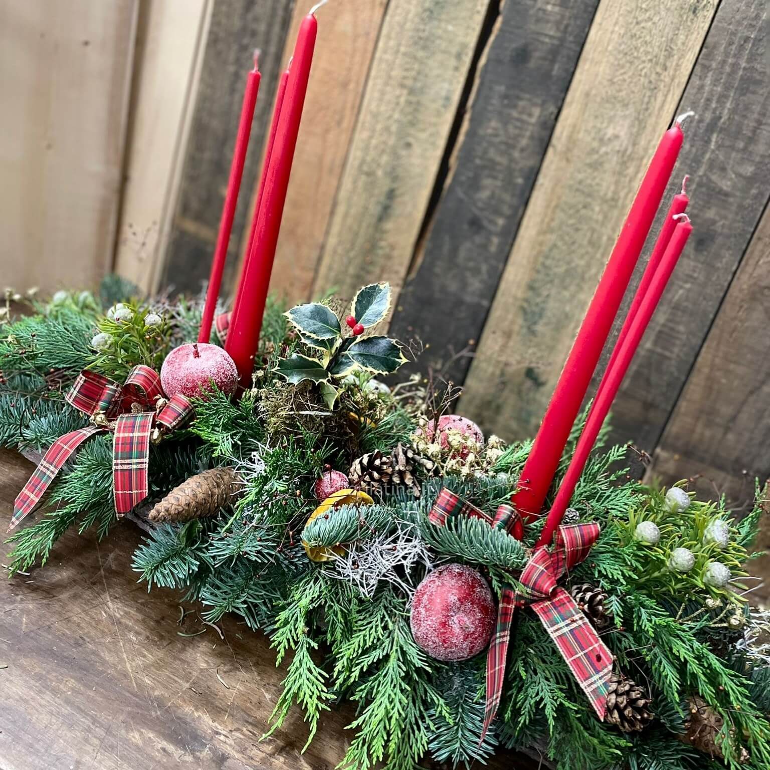 Scopri il nostro esclusivo Centrotavola di Natale ovale con candele, realizzato con passione e cura dal tuo Fiorista a Aprilia.