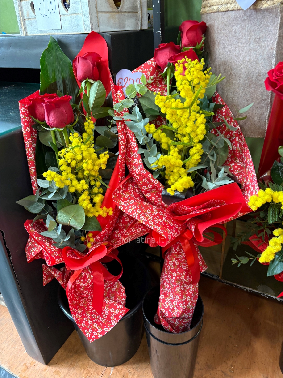 | Tralcio di 5 rose rosse a gambo lungo con mimosa Cod. 125839 | € 30,00 | Quantità : | |